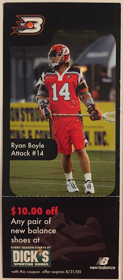 In 2004-2005, a Ryan Boyle trading card with attached New Balance shoes coupon was issued by Dick’s Sporting Goods in the Philadelphia area. The manner in which the cards/coupons were distributed is unknown.